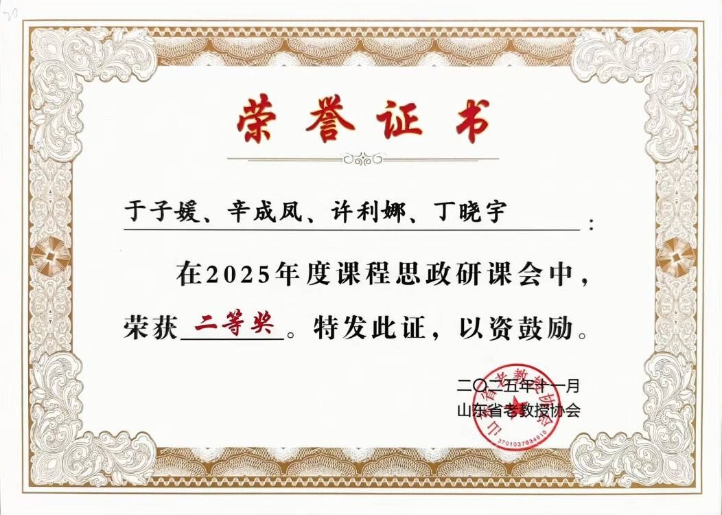 在山东省老教授协会主办的2025年度课程思政研课会中,五年制大专学院于子媛、辛成凤、许利娜、丁晓宇四位教师组成的课程团队,凭借扎实的课程思政建设方案荣获二等奖。