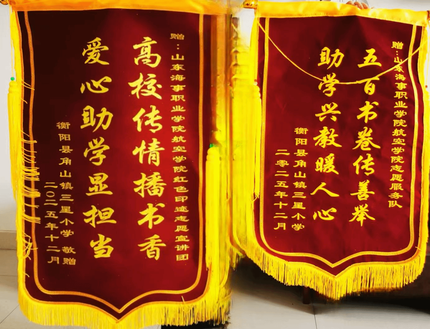 学院志愿者代表带着全体学子的深情,将书籍送往衡阳县角山镇三星小学并完成捐赠。捐赠仪式上,孩子们接过崭新的书籍,迫不及待地翻开阅读,眼中闪烁着对知识的渴望,脸上洋溢着纯真的笑容。校方对航空学院的善举表示由衷感谢,并向航空学院志愿服务队与“红色印迹”志愿宣讲团回赠锦旗。这既是对此次捐书活动的高度肯定,也是对学院育人成效的充分认可。