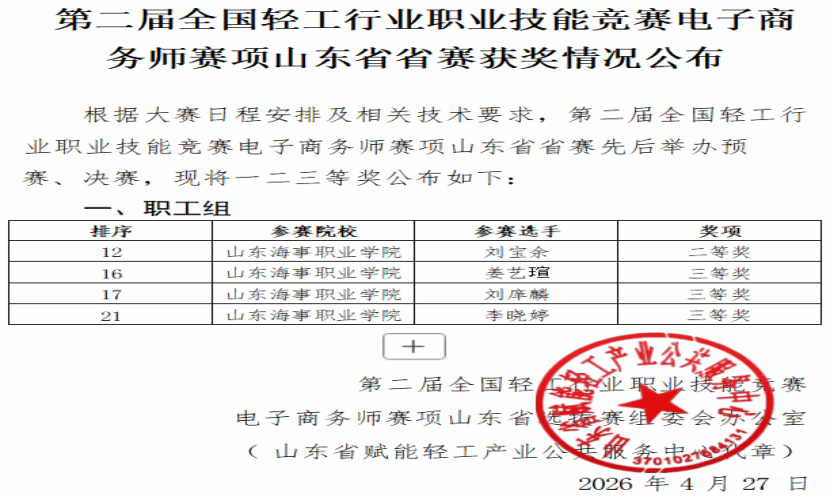 近日,在2026年全国行业职业技能竞赛第二届全国轻工行业职业技能竞赛电子商务师赛项(职工组个人赛)山东省决赛中,我校电子商务专业教师刘宝余、刘庠麟分获二、三等奖,关务与外贸服务专业教师姜艺瑄、李晓婷分获三等奖。