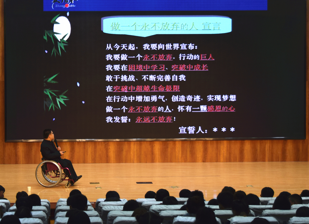 报告会上,在李乐龙老师的带领下,在场全体学生还一起做了宣誓,要“做一个永不放弃的人,怀有一颗感恩的心”。李乐龙老师的报告为同学们的生活注入了正能量,促使同学们学会坚强地应对生活中的困难,永不言弃、砥砺前行。