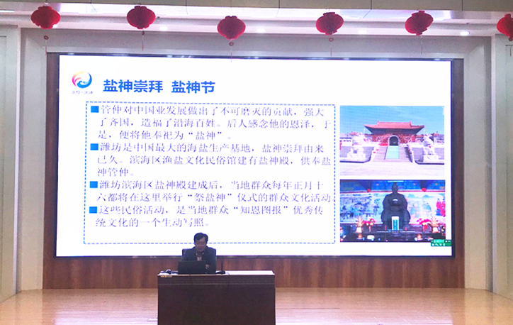 毛老师向在场学生分别介绍了不同时期的潍坊滨海海洋文化发展情况,并讲到,潍坊是中国最大的海盐生产基地,全国海盐“半出潍坊”,而潍坊滨海是世界海盐文化始发地,文物普查队曾在潍坊滨海区央子街道发现了“东周盐业遗址群”。随着山东半岛蓝色经济区发展战略的实施,潍坊滨海经济技术开发区作为潍坊沿海地区的核心区也被列入国家海洋经济新区。研究、挖掘潍坊海洋文化,滨海区地方历史文化是蓝色经济区发展战略实施极为重要的内容。另外,毛老师还向在场师生讲述了“中国海盐之都”、“华夏盐宗故里”、“齐鲁渔盐古镇”和“红色革命圣地”等称号的历史来源及相关历史故事,让在场师生对潍坊滨海的海洋文化有了生动形象的全新认识。
