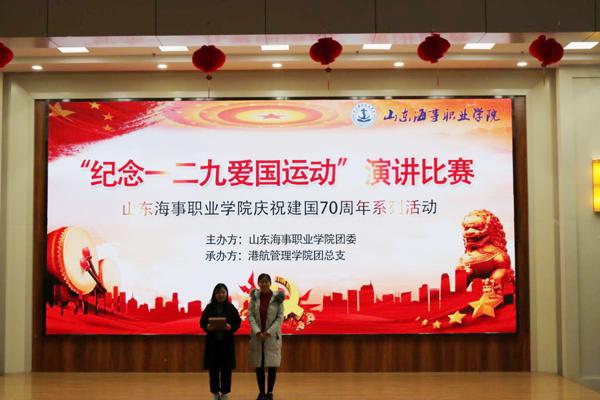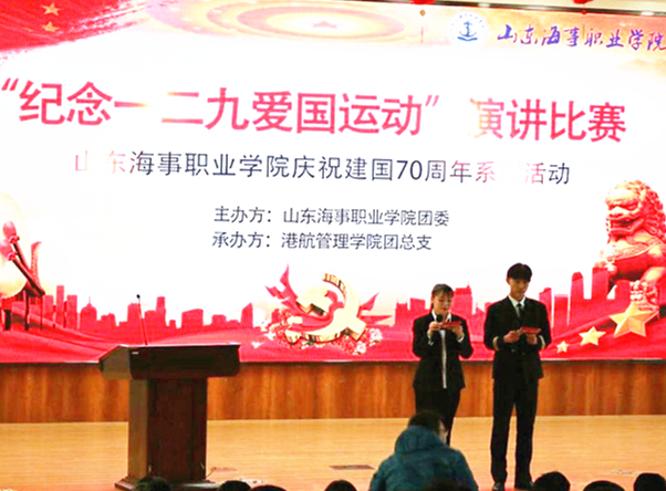 12月12日下午,由校团委主办,港航管理学院团总支承办的,纪念“一二·九”爱国运动主题演讲比赛在图书馆报告厅举行。本次比赛由团委书记李雪、港航管理学院院长助理程美旺以及各二级学院团总支书记担任评委。选手围绕“一二·九”爱国主义运动主题展开精彩演讲。最终,来自机电与信息工程学院的盛桂萌荣获一等奖,来自航空学院的丁露露和来自五年制大专学院的白国玉获得二等奖,港航管理学院齐晓龙、航海学院李哲怡、航空学院田明琦荣获三等奖。