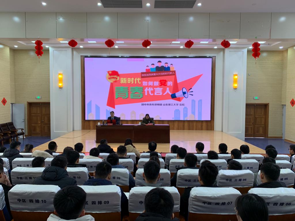 12月23日上午,学校团委邀请团中央青年讲师团讲师、山东理工大学思政教师岳松在图书馆报告厅举办题为《新时代如何做党的青春代言人》的主题报告会。旨在深入学习贯彻党的十九大精神和十九届四中全会精神,持续深化理想信念教育,不断提高青年骨干教师的思想政治理论和创新实践能力,引导学生干部以正确思想武装自己,增强山海院学子自身责任感、使命感,引导学校优秀青年学子积极做党的青春代言人。我校党委副书记、副校长徐立清出席活动,我校党员教师及学生骨干400余人共同参加。报告会团委书记李雪主持。