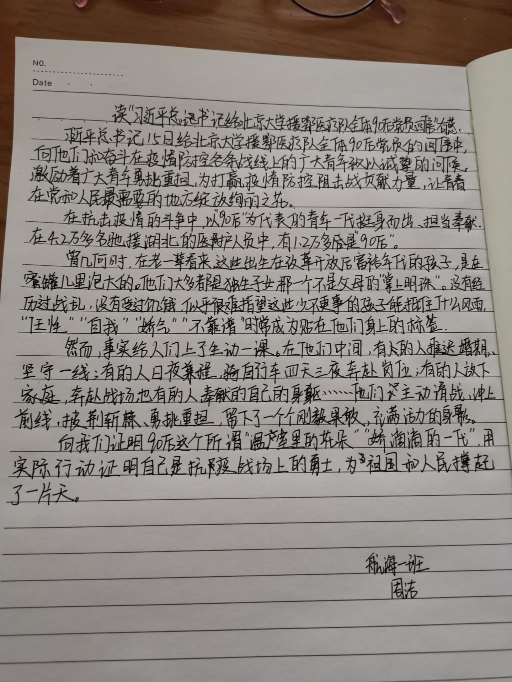 一篇航海学院学生学习《习近平总书记给北京大学援鄂医疗队全体90后党员的回信》精神后的读后感