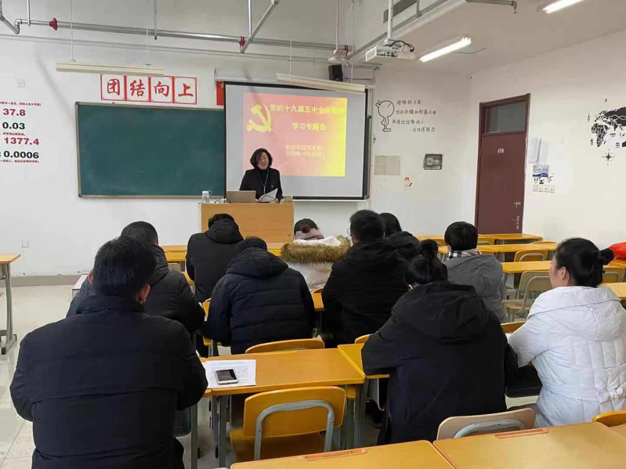 为深入学习贯彻党的十九届五中全会精神,12月23日下午,航空学院党支部组织全体党员和教工入党积极分子,举办了一场学习贯彻十九届五中全会精神宣讲会。党支部书记马云芹首先结合党的历次会议相关政治常识知识做了简要介绍,对如何理解和把握增强“四个意识”,坚定“四个自信”,做好“两个维护”以及“五年计划/规划”、“两个一百奋斗目标”等问题做了阐述。重点结合党的十九届五中全会精神要点进行了较系统的辅导。宣讲会还结合十四五期间山海院高职教育提质升级以及专升本的目标要求,结合航空学院十四五期间的进一步加强校企合作,推动混合制二级学院的创新发展,进行了探讨。宣讲会后,学院还组织党员和入党积极分子集中观看了学习视频《十九届五中全会会议精神解读》。会后组织党员和入党积极分子撰写学习心得,进一步加深对十九届五中全会精神的理解。