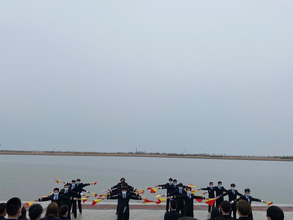 上午九点,海祭仪式正式开始,首先进行的是出校旗,学校国旗护卫队同学踏着整齐的步伐迎面走来,悼念敬爱的革命先烈。师生们齐唱国歌,沉重悼念革命先烈,表达对于革命先烈的崇敬之情。航海学院的同学进行了旗语表演,旗帜挥舞间,他们互相配合,刚劲有力,展现了当代大学生特有的青春气息和无限活力。