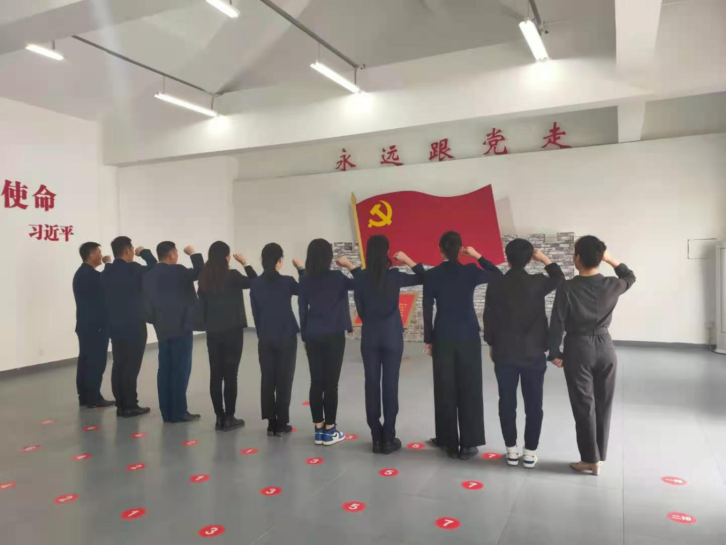在潍县战役胜利70周年纪念大厅,在鲜红的党旗下,全体党员握起拳头,重温入党誓词,表达内心的忠诚。