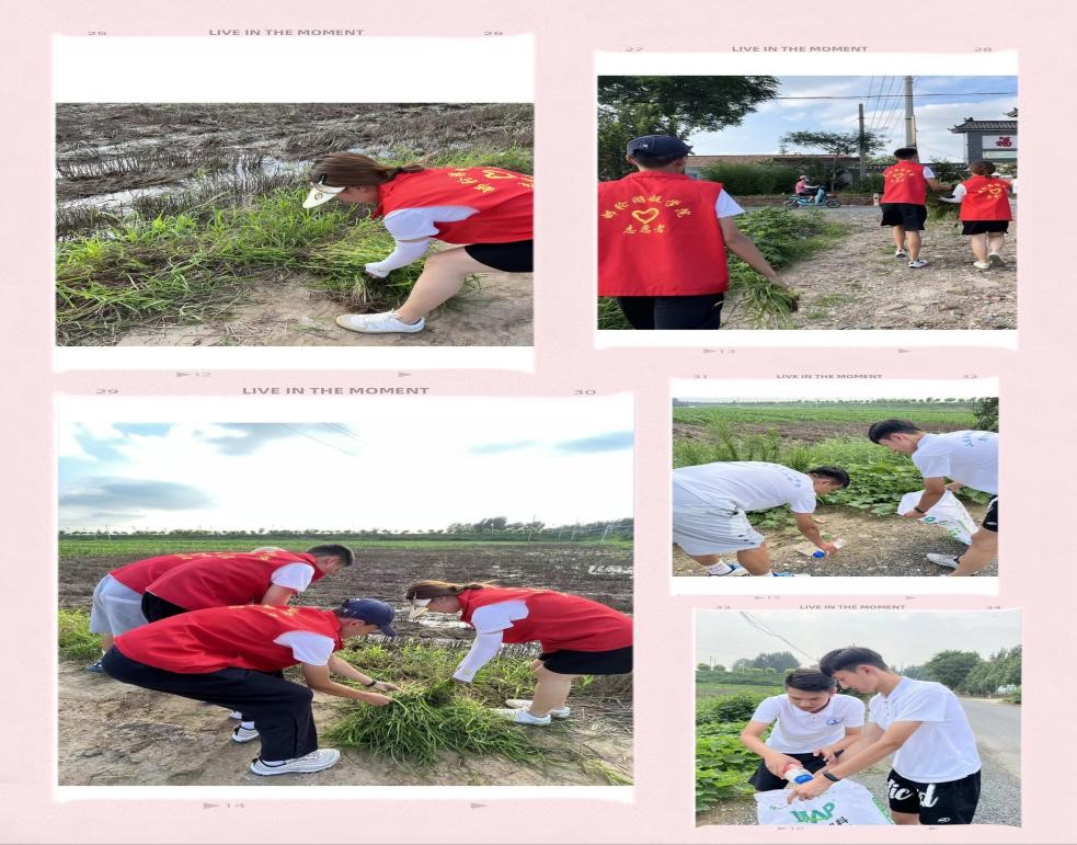图为志愿者们防污染源捡拾路边的农药瓶和拔田间杂草