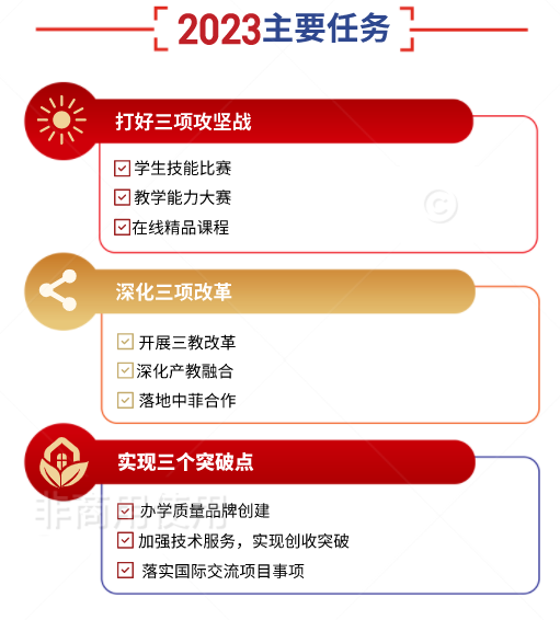 2023年是全面贯彻落实党的二十大精神的开局之年,是实施“十四五”规划承上启下的关键之年,也是学院立足新起点、谋篇布局实现新一轮发展的重要一年。2023年学院工作总体目标是以习近平新时代中国特色社会主义思想为指导,以党的建设为统领,以高素质技术技能人才培养为核心,全力推动高素质技术技能人才培养基地、产业学院等重点项目建设;扩规模、调结构,提高办学质量,增强发展动力,扩大学院影响力,开创新时代学院事业发展新局面。