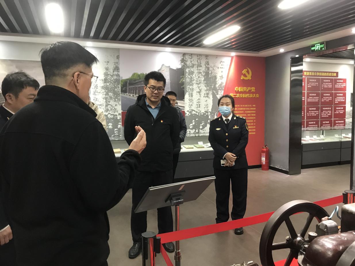 下午3时许,一行人来到了位于昌邑市龙池镇的全武红色博物馆,进入红色博物馆,在毛主席塑像前,全体人员庄严肃立并三鞠躬,随后,王全武馆长一边带领党员同志们参观馆藏文物一边为参观人员讲解文物历史。参观过程中,部分党员还亲身体验了军用手摇报警器和其他藏品。