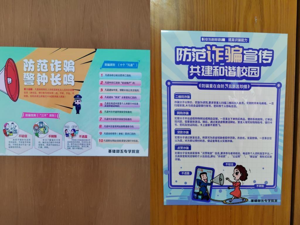 活动1 主题宣传。学院通过悬挂宣传条幅,张贴宣传小海报等形式向同学们传递防诈知识。