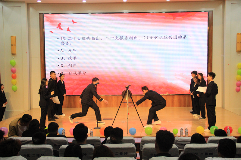 本次竞赛活动中,学校九个二级学院各派出一支代表队参赛,竞赛分为“1V1对抗赛”和“小组计时赛”,设有“个人必答题”“集体必答题”“抢答题”三个环节,题目围绕党的二十大重要内容、新党章等相关内容开展,全面考察了参赛选手的理论知识和学习成果。