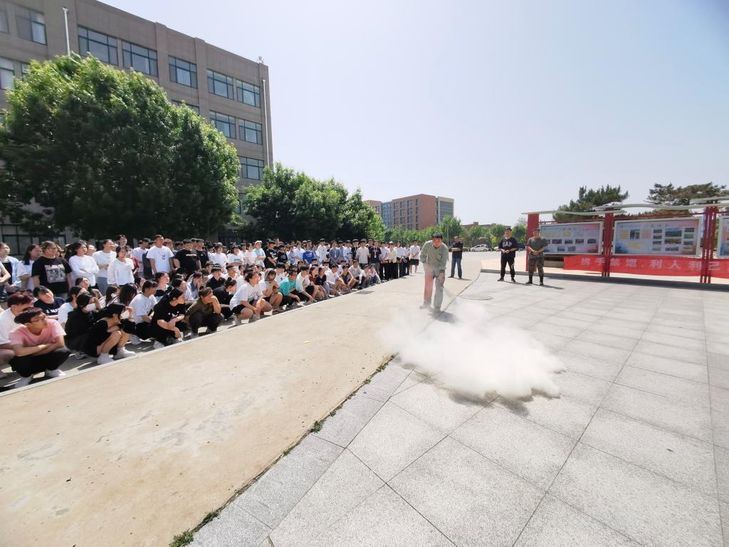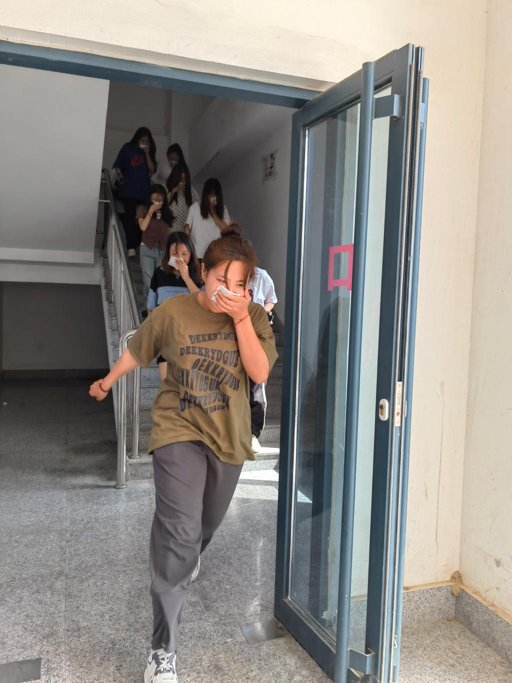 此次演练共分为两个环节,一是演练学生上课期间教学楼突发火情紧急疏散场景,二是现场进行灭火器的操作演示。在突发火情紧急疏散环节,随着指挥员下达的疏散指令响起,各楼层疏散员立即到达指定位置,各班按照方案分方向、按路线向安全出口方向进行紧急疏散。演练过程中,全体师生本着“安全第一”的原则,快速有序地撤离到教学楼下安全地带并集合清点人数。在灭火器的操作演示环节,安管处孟凡明老师按照“提、拔、握、压”操作步骤,向观摩师生详细讲解了灭火器操作规范,部分学生代表现场体验了灭火器的使用方法,通过实战方式来提高大家实际灭火操作能力。