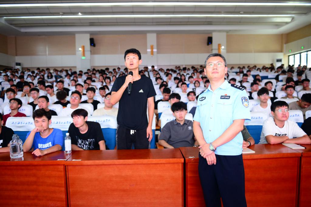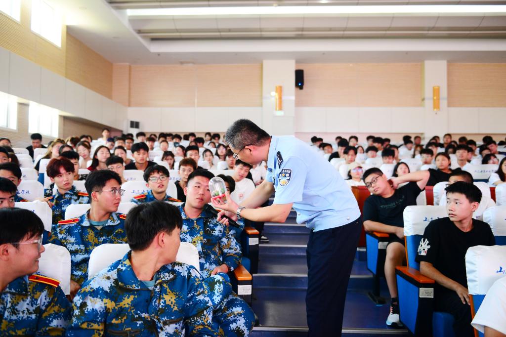 为深入贯彻落实党的二十大精神,加强对我校学生的反诈禁毒宣传预防教育,提高学生安全防范和自我保护能力,9月7日,我校邀请大学园派出所综合指挥室主任朱英杰、禁毒大队综合科副科长王东东在图书馆报告厅为我校学生做禁毒与反诈知识讲座,2023级新生代表共450余人参加讲座。