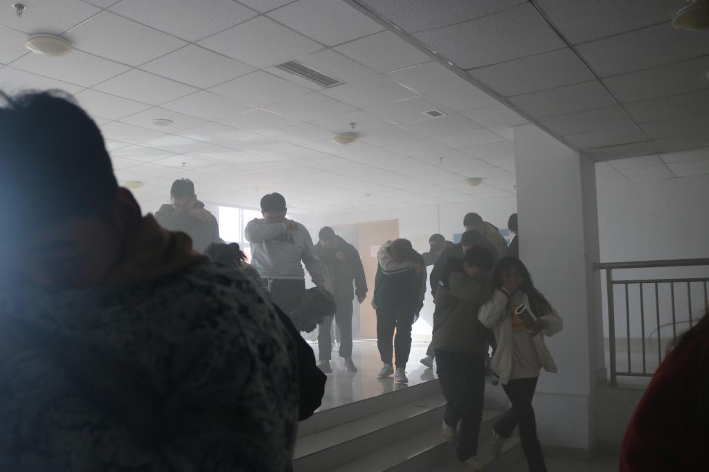 下午3:10分,随着警笛声响起,各班同学在任课老师的引领下用湿毛巾捂住口鼻,按照指定路线快速有序地进行疏散。3分钟后,演习楼层所有师生全部撤离到安全地带。随后,工作人员向大家介绍并示范了灭火器的正确使用方法,现场模拟火情并让同学们实际操作使用灭火器,提升了大家火情初期的控制能力。