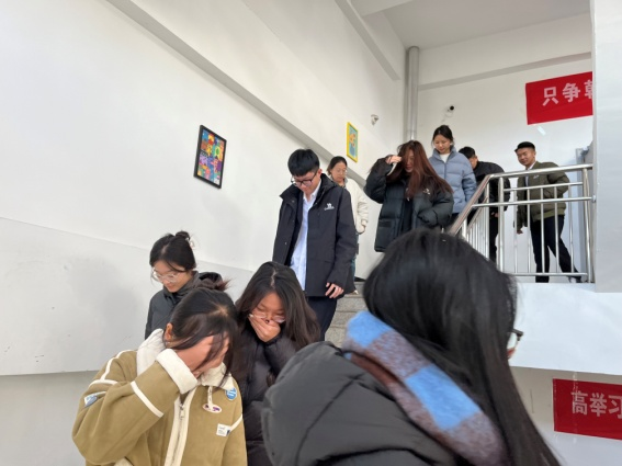 下午3点10分,3号教学楼内响起了急促的消防演习警报声,全体教师急速上岗。各班听到警报声后,反应迅速,在辅导员及任课老师的带领下,同学们用毛巾捂住口鼻,弯腰靠墙,有秩序地沿着疏散路线紧急撤离到3号教学楼外的广场。各班清点人数,向总指挥报告。整个演练过程用时4分32秒,其间无拥挤情况发生,撤离工作并然有序。