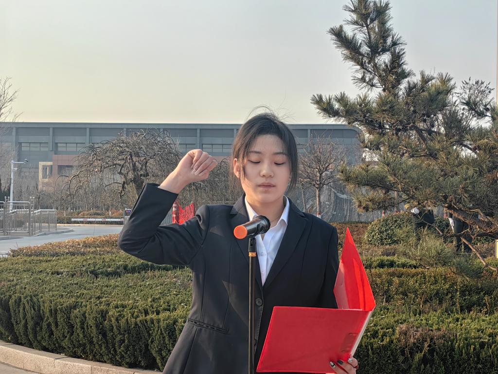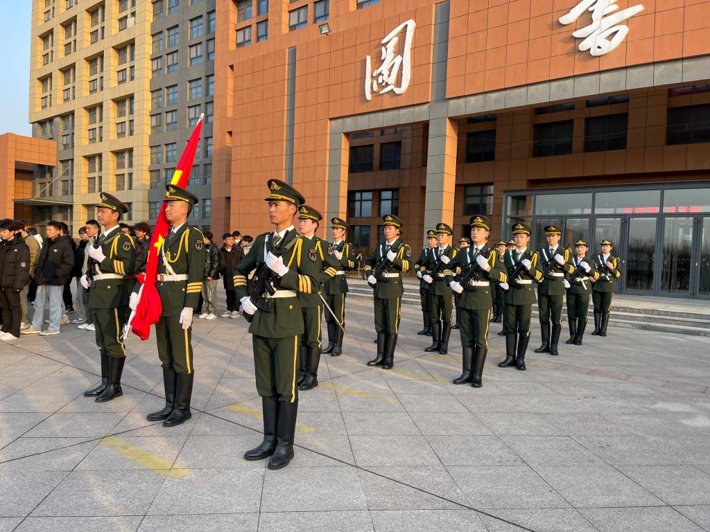 早上7点整,升旗仪式正式开始。国旗护卫队成员迈着整齐而坚定的步伐来到了国旗台下。伴随着雄壮豪迈的国歌,鲜艳的五星红旗冉冉升起。全体奏唱国歌、行注目礼,庄严肃穆。