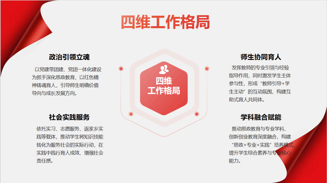 智能与信息工程学院深耕“智信红途”党建品牌内涵,将党的建设与智能制造和新一代信息技术专业发展、人才培养深度融合,构建“政治引领立魂、专业融合赋能、师生协同育人、社会实践服务”的四维工作体系。